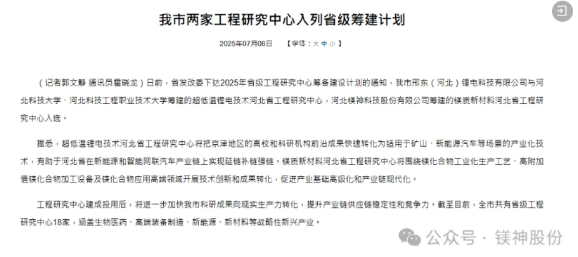 2025年7月8日,河北省發(fā)展和改革委員會正式公布了新一批河北省工程研究中心籌建計劃入選名單。由河北鎂神科技有限公司(簡稱:鎂神科技)牽頭籌建的“鎂質(zhì)新材料河北省工程研究中心”經(jīng)過嚴格遴選和專家評審,成功獲批立項,正式列入省級工程研究中心籌建計劃名單!這是鎂神科技發(fā)展歷程上的又一重要里程碑,也是河北省對我公司在鎂質(zhì)新材料領域創(chuàng)新能力與發(fā)展?jié)摿Φ母叨日J可!